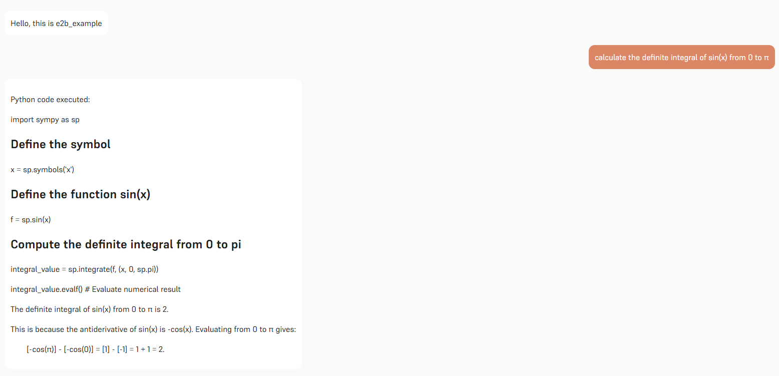 To reduce hallucinations and increase precision in mathematical computations, the LLM can call the execute_python tool. When invoked, the code is executed in a secure E2B sandbox environment, ensuring accurate results and safe code execution.
