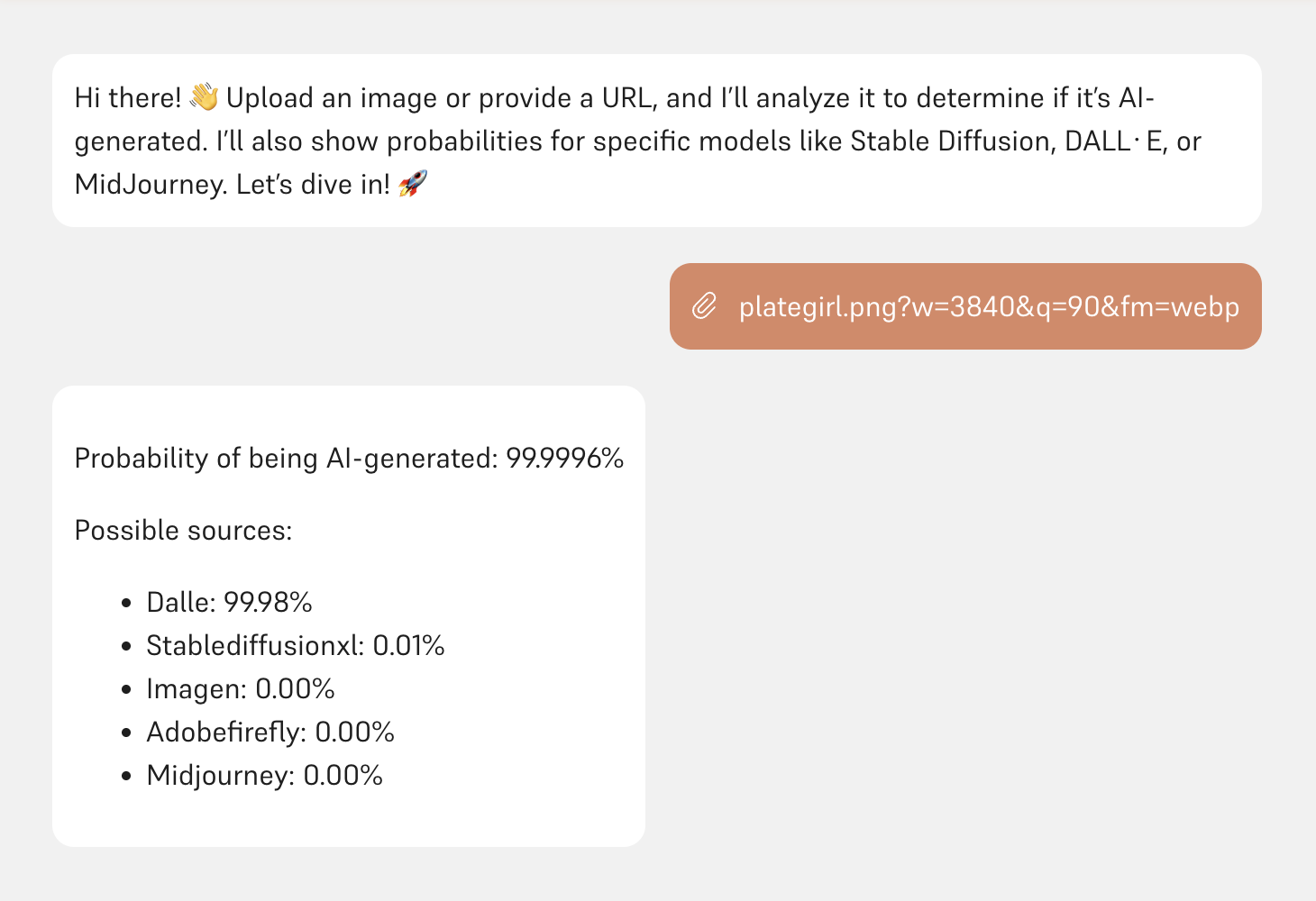Curious to see how it works? We’ve hosted our AI-detecting chatbot on our website, so you can try it out for yourself! Just upload or link an image, and the chatbot will tell you if it’s AI-generated. Click here to try our AI-Detecting Chatbot